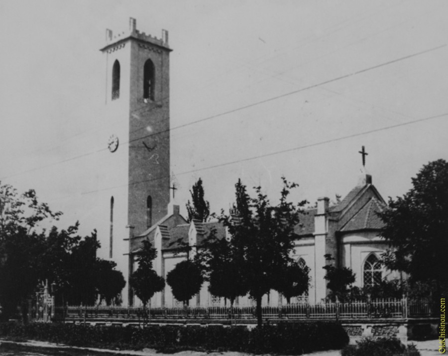 Кирха (лютеранская церковь). Располагалась на углу нынешних бул. Штефана чел Маре и ул. М. Чеботарь. В советский период в здании располагался кукольный театр и Дом офицеров. Кирха была снесена в 1959 году. Фотография межвоенного периода.